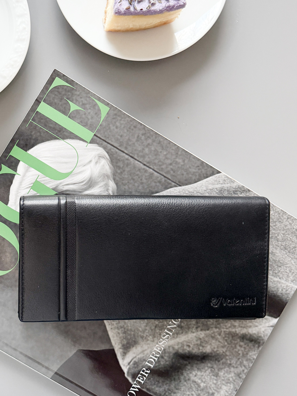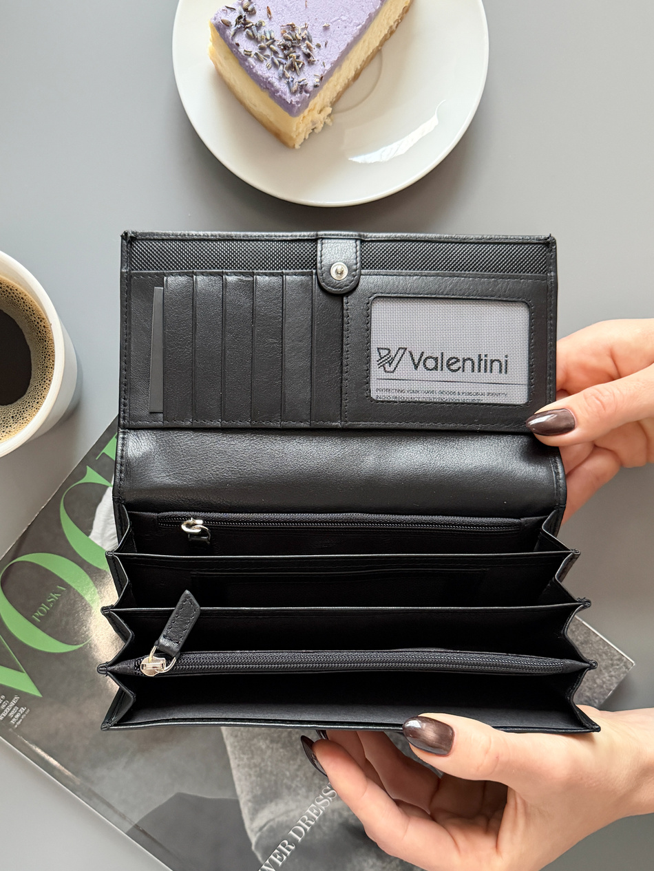 Na froncie portfela znajduje się wytłoczone logo Valentini oraz fakturowany pasek – całość jest klasyczna, ponadczasowa, a zarazem elegancka. Portfel został wykonany z wysokiej jakości skóry naturalnej.