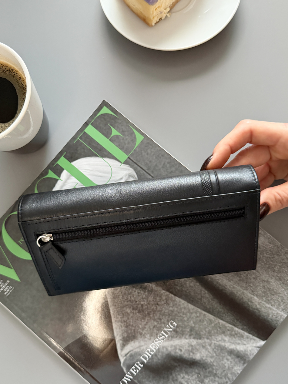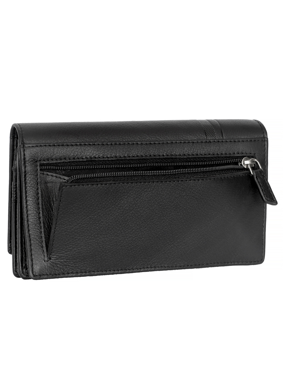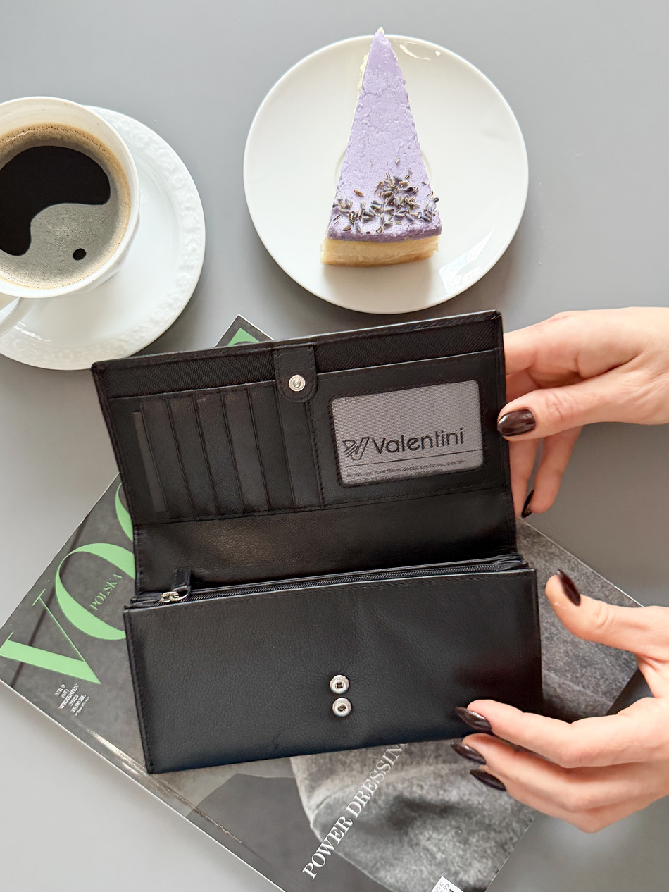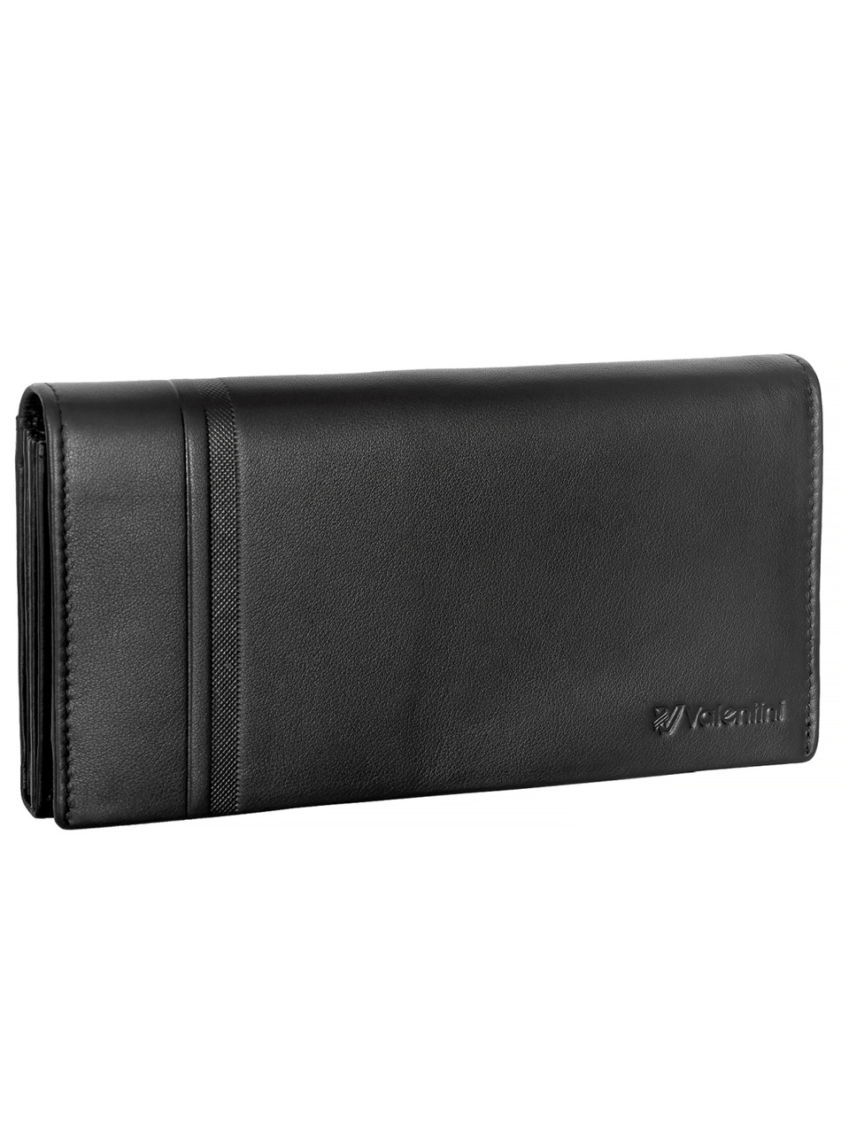 - Skórzany poziomy portfel damski zapinany na zatrzask z kolekcji Trophy od Valentini w kolorze czarnym.
