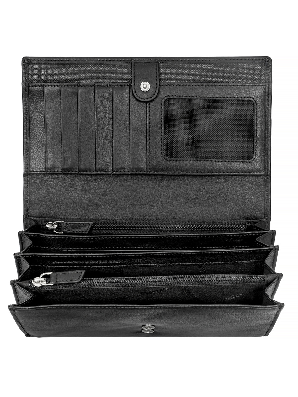 Poziomy portfel damski zapinany na zatrzask z kolekcji Trophy od Valentini o wymiarach 19,3 x 9,5 cm.Produkt posiada aż 14 miejsc na karty, 3 na dokumenty, a także 4 przegrody na banknoty. Wewnątrz mieszczą się 2 kieszenie na bilon zamykane na zamek. Portfel jest bardzo pojemny i znakomicie zorganizowany.