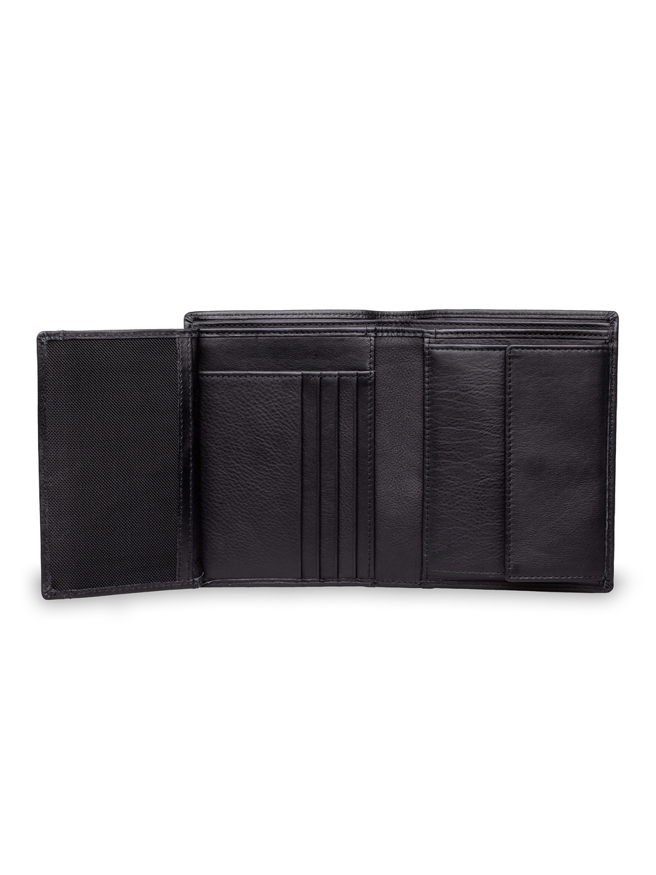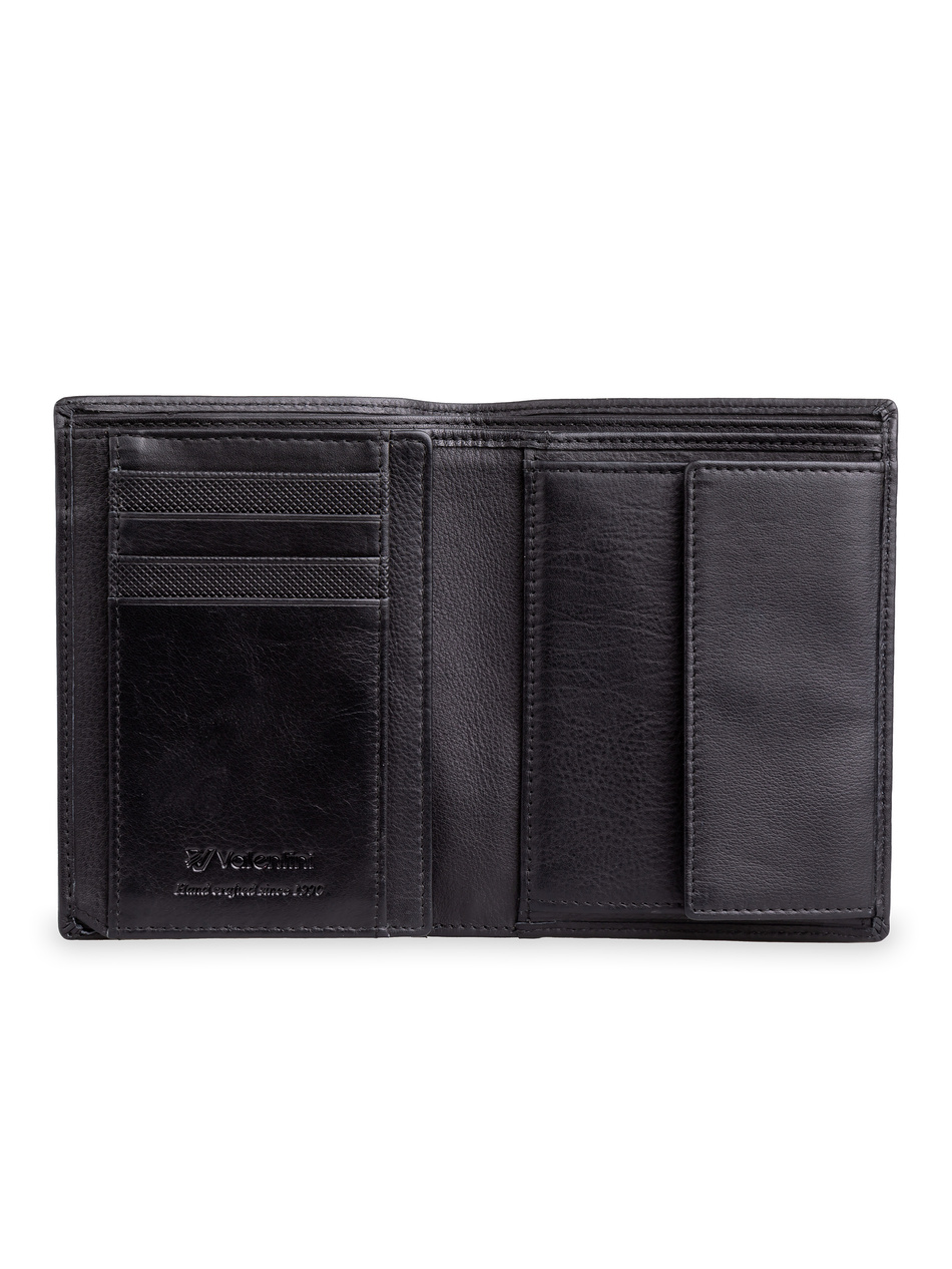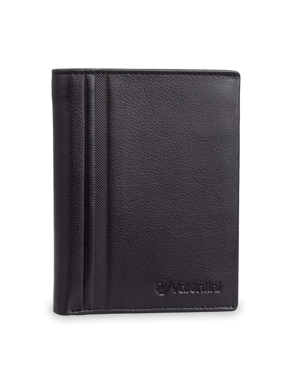 Męski portfel o układzie pionowym z kolekcji Trophy od Valentini wymiarów: 10 x 13 cm. Wewnątrz produkt posiada 5 miejsca na dokumenty, 8 na karty oraz kieszeń na bilon zamykaną na zatrzask. Na froncie znajduje się wytłoczone logo Valentini oraz fakturowany pasek – całość jest klasyczna, ponadczasowa a zarazem elegancka. Portfel został wykonany z wysokiej jakości skóry naturalnej.Zapytaj o produkt