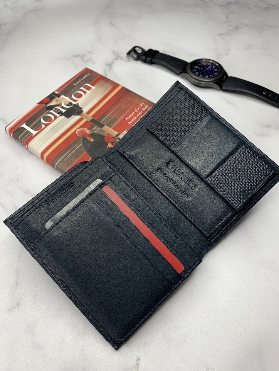 - Niebieski portfel męski pionowy z ochroną RFID Valentini Yew.