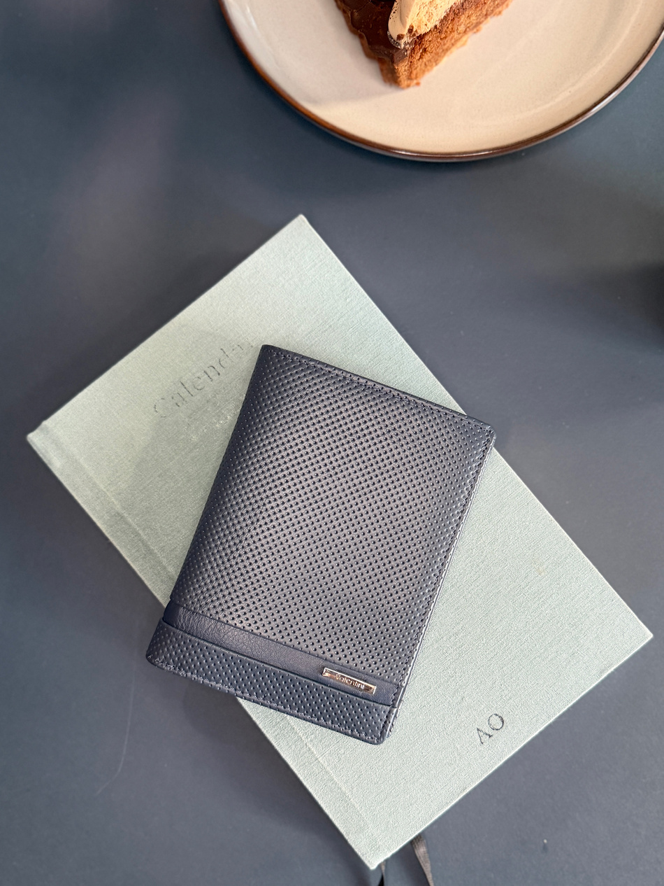 - Marineblaue vertikale Herrengeldbörse aus perforiertem Leder.