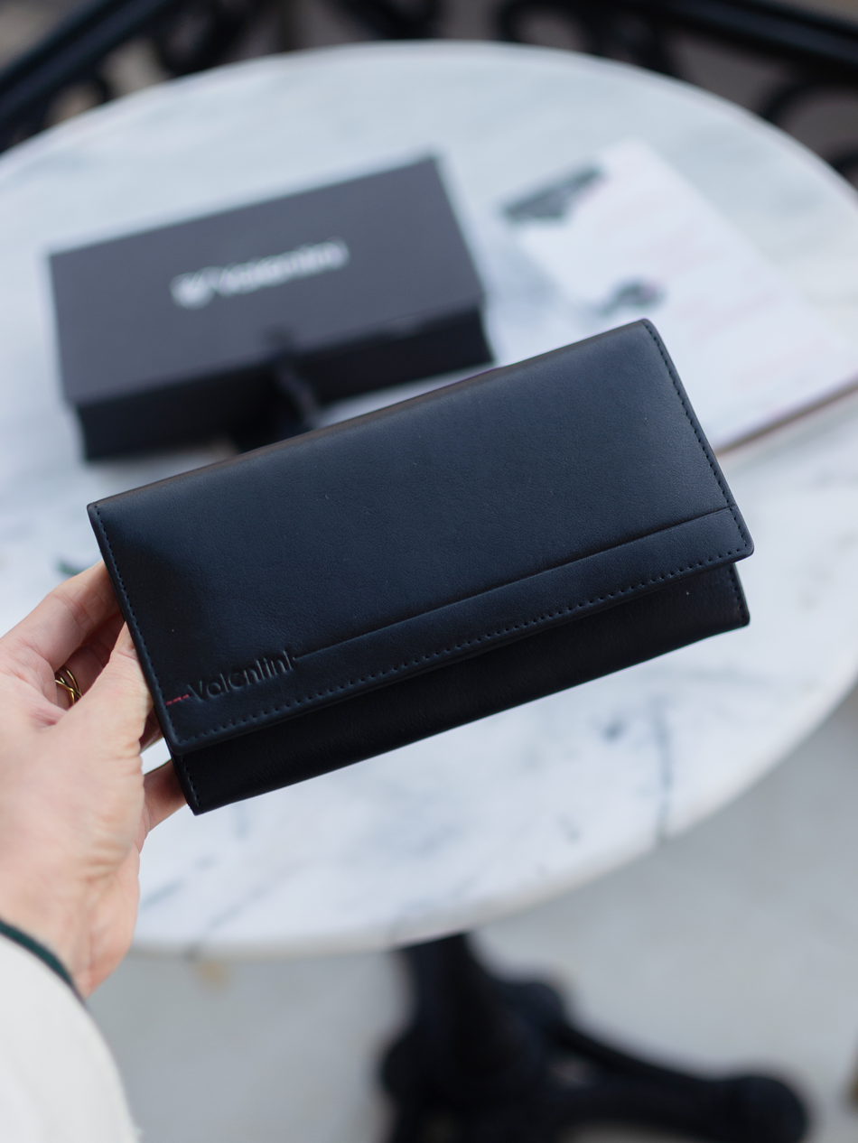 • Schwarze horizontale Damengeldbörse aus weichem Naturleder.