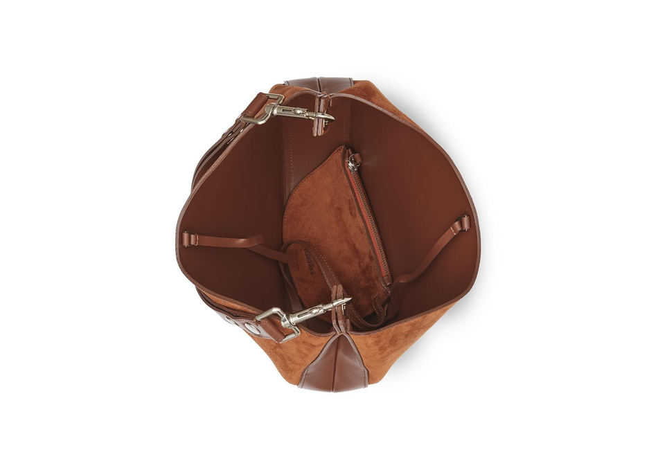 - Damenhandtasche aus Leder mit breitem Riemen und goldenen Beschlägen.