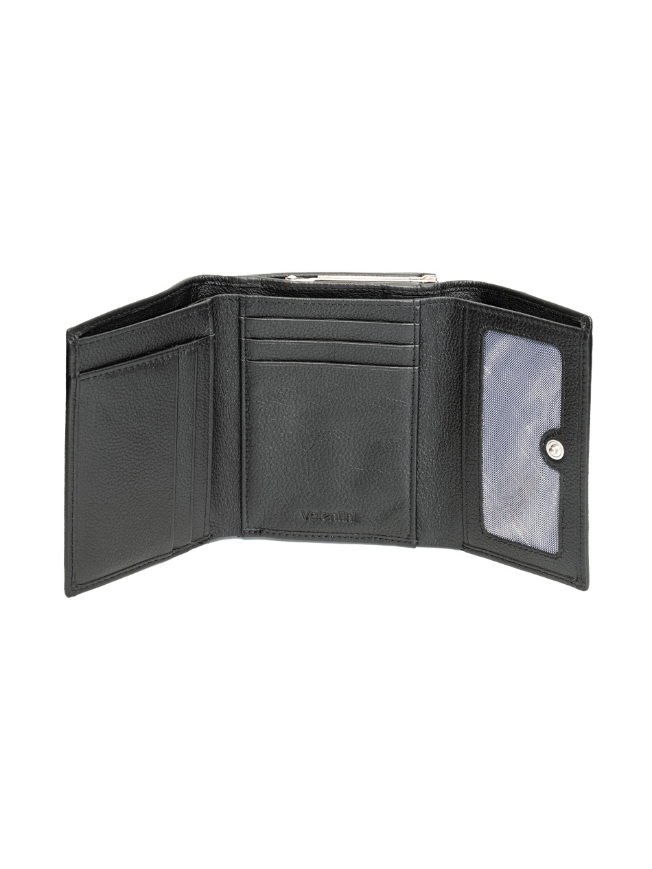 Das schwarze Portemonnaie Valentini Metallic 445 ist die ideale Wahl für Frauen, die im Alltag Eleganz und Praktikabilität schätzen. Gefertigt aus echtem Leder, begeistert es durch Langlebigkeit und zeitlosen Stil. Mit seinen Maßen (12 × 10 cm) passt es perfekt in mittelgroße und größere Handtaschen. Das Portemonnaie bietet 8 Kartenfächer, ein inneres Netzfach für Dokumente sowie 2 separate Geldscheinfächer. Für Münzen gibt es ein Fach mit Druckknopf, das schnellen Zugriff ermöglicht und Ordnung schafft. Dank des RFID-Schutzes kannst Du sicher sein, dass Deine Karten und persönlichen Daten vor unbefugtem Auslesen geschützt sind.