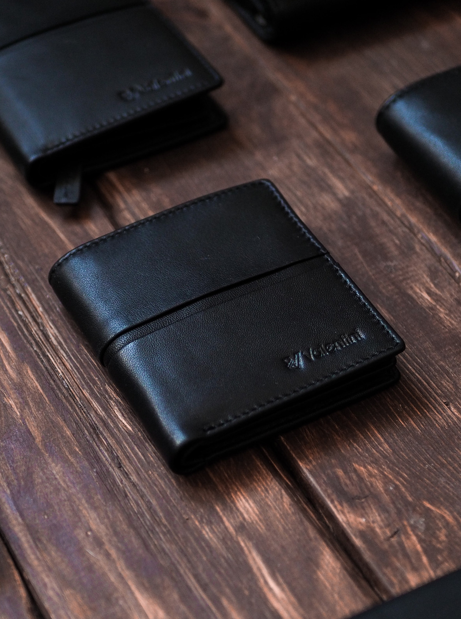 - Mały portfel męski, poziomy o wymiarach: 9,5 x 10 cm, wykonany z miękkiej cielęcej skóry.