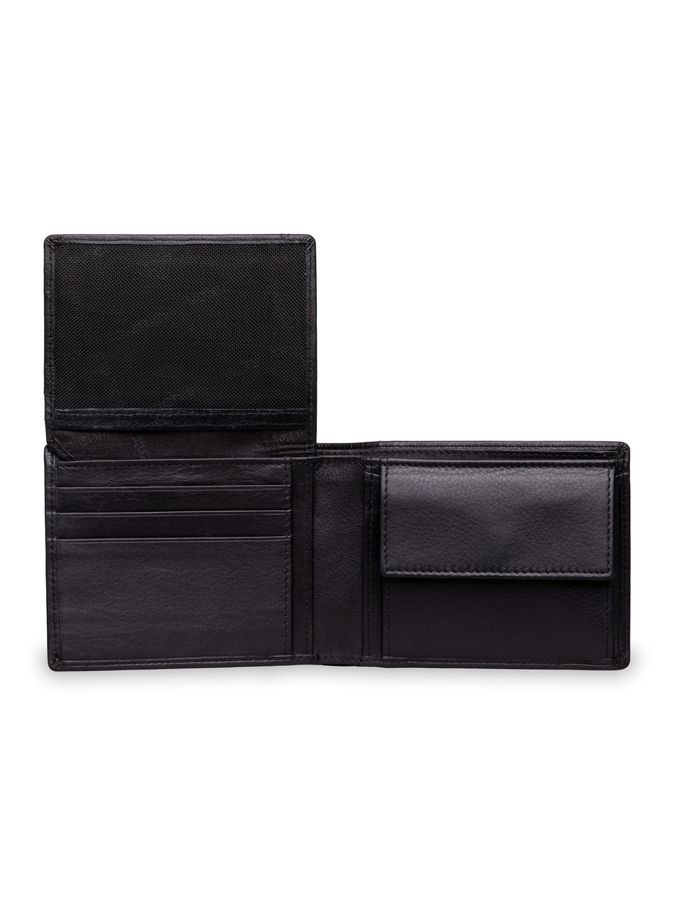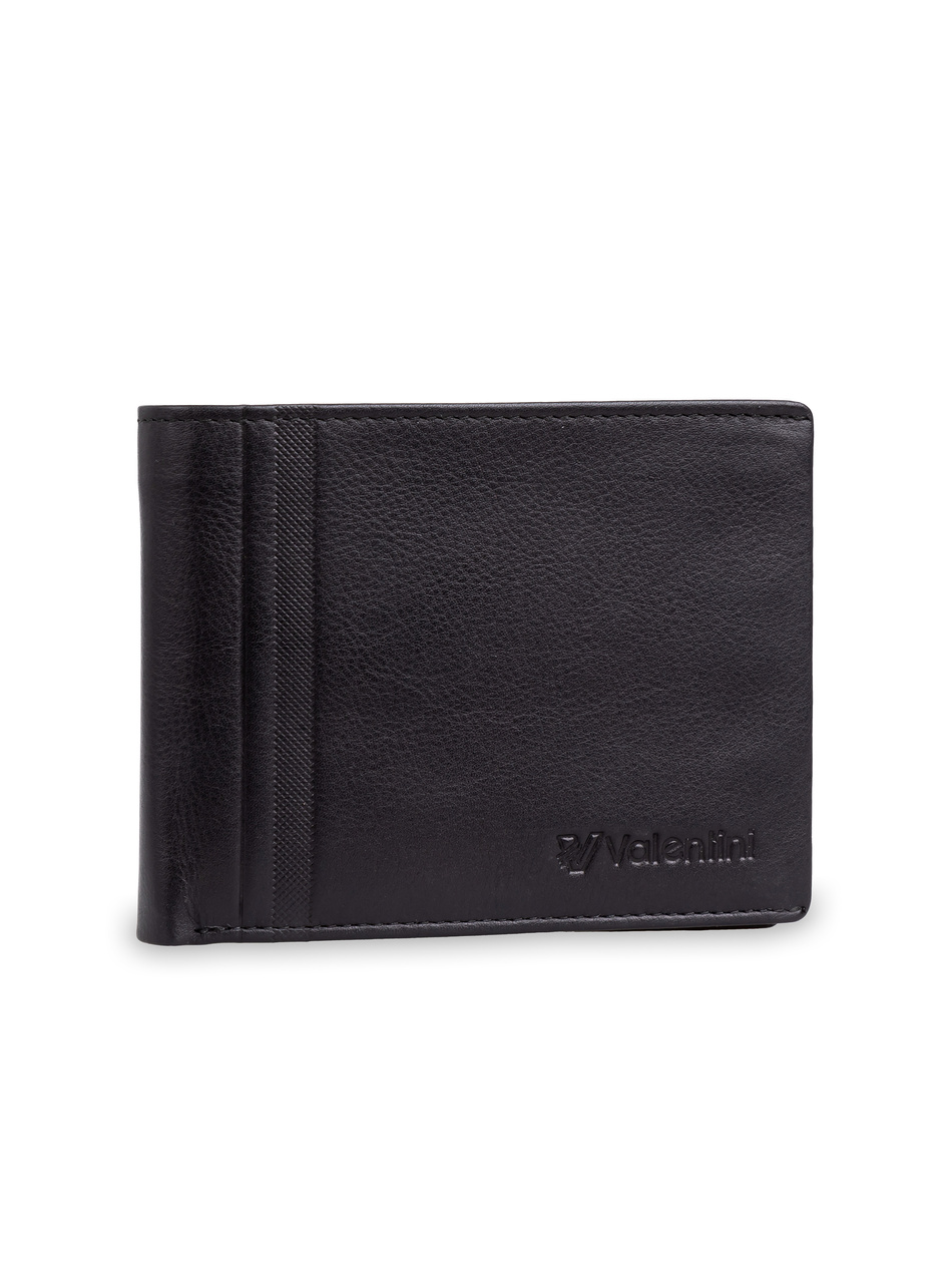Męski portfel o układzie poziomym z kolekcji Trophy od Valentini wymiarów: 11 x 9 cm. Wewnątrz produkt posiada 4 miejsca na dokumenty, 6 na karty oraz kieszeń na bilon zamykaną na zatrzask. Na froncie znajduje się wytłoczone logo Valentini oraz fakturowany pasek – całość jest klasyczna, ponadczasowa a zarazem elegancka. Portfel został wykonany z wysokiej jakości skóry naturalnej.