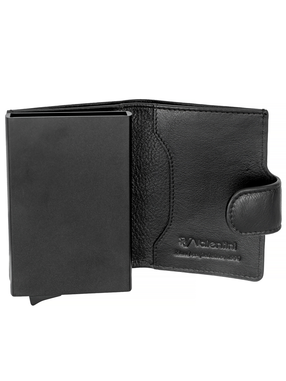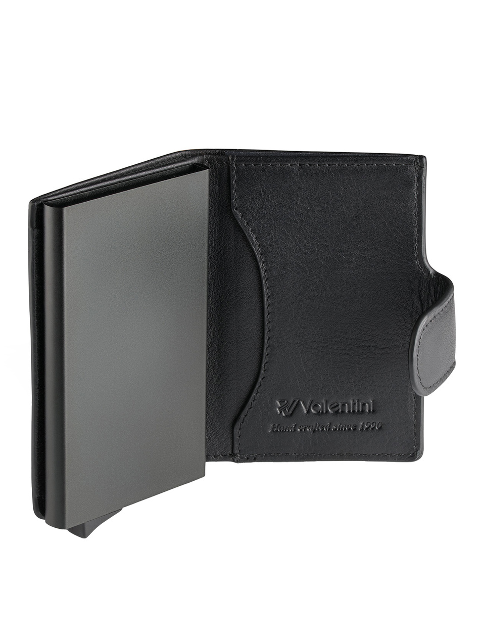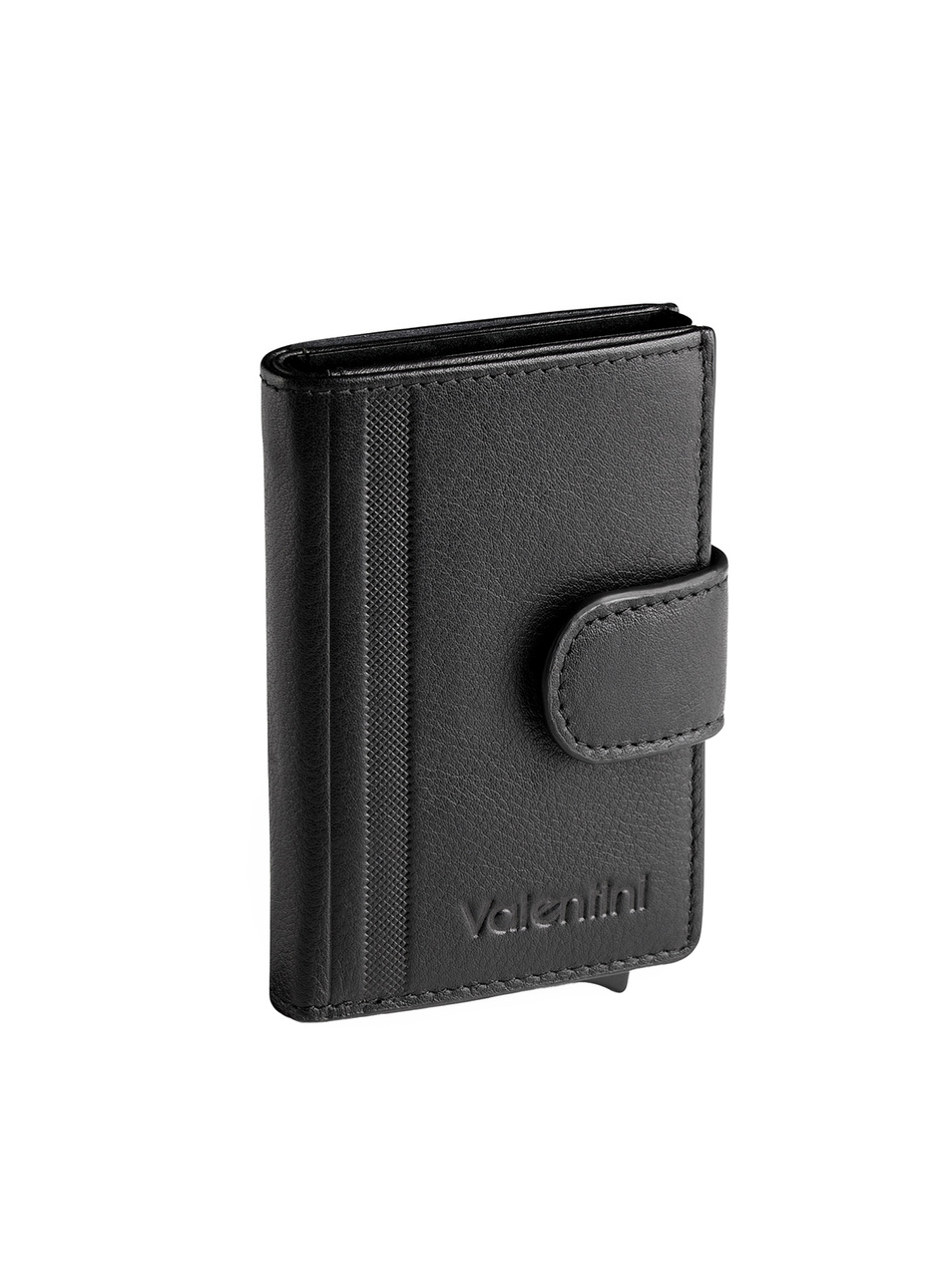 Skórzany portfel z wysuwaną kieszenią na karty z kolekcji Trophy od Valentini w kolorze czarnym o wymiarach 7 x 10 cm.Produkt posiada 2 miejsca na karty, dodatkową kieszeń na dokumenty, a także przegrodę na banknoty. Zapięcie zewnętrzne jest na zatrzask. Portfel jest wykończony z najwyższą starannością, w klasycznym odcieniu czerni.